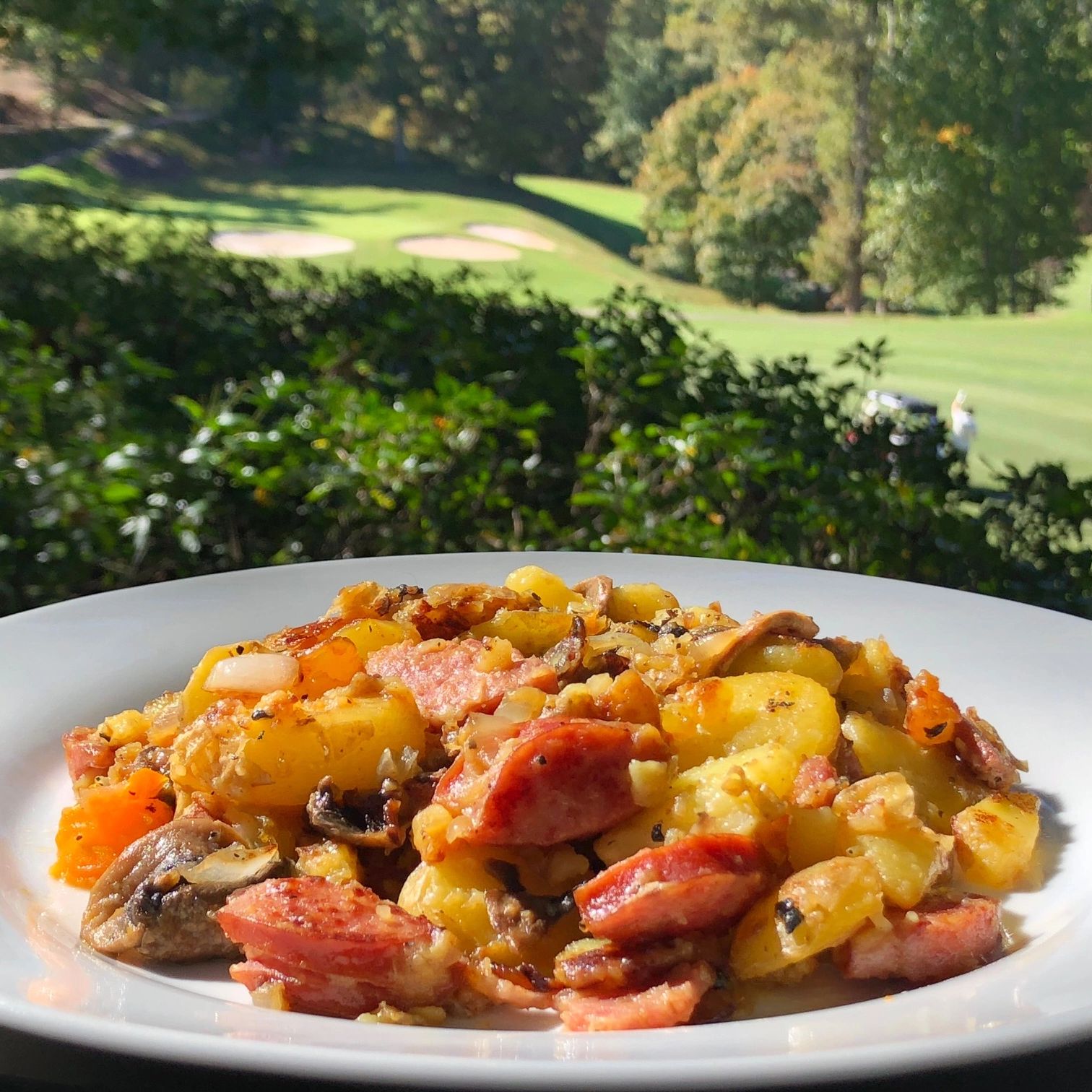 This month's lunch selection was the traditional "Bauernpfanne" or "Farmers Skillet". It includes potatoes, hickory smoked sausage, sautéed mushrooms, and tomatoes. The perfect lunch for this time of the year.