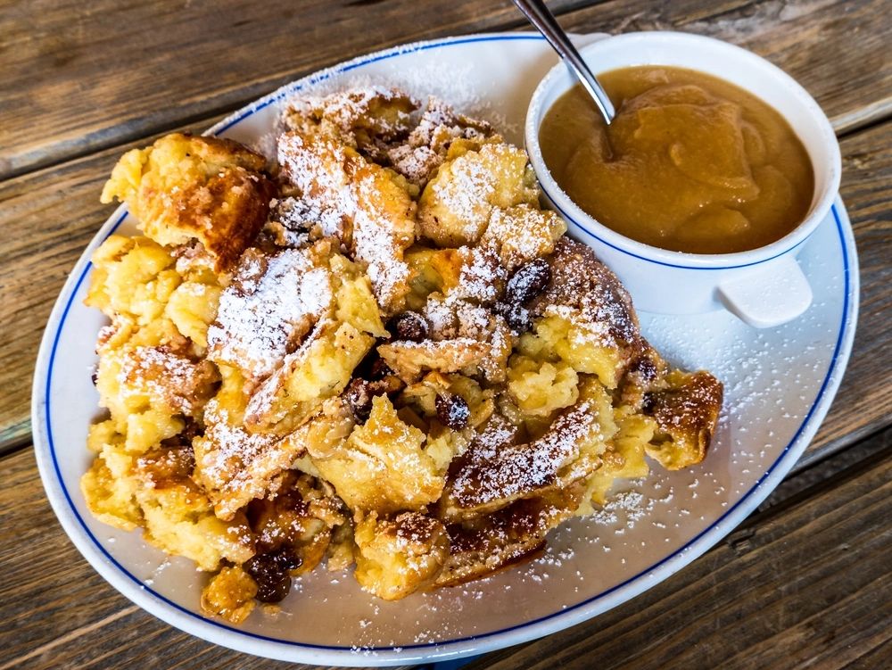 Kaiserschmarrn, a fluffy, caramelized pancake torn into bite-sized pieces, is a beloved Austrian treat, often dusted with powdered sugar and served with fruit compote. Light and airy on the inside with crispy, golden edges, it combines the textures of a pancake and the indulgence of a dessert.